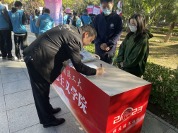 清晨的阳光刚刚升起,学院在图书信息楼北侧广场设置接待点,准备签名表、校友礼包、纪念品等。学院师生以饱满的热情,准备迎接每一位到来的校友。